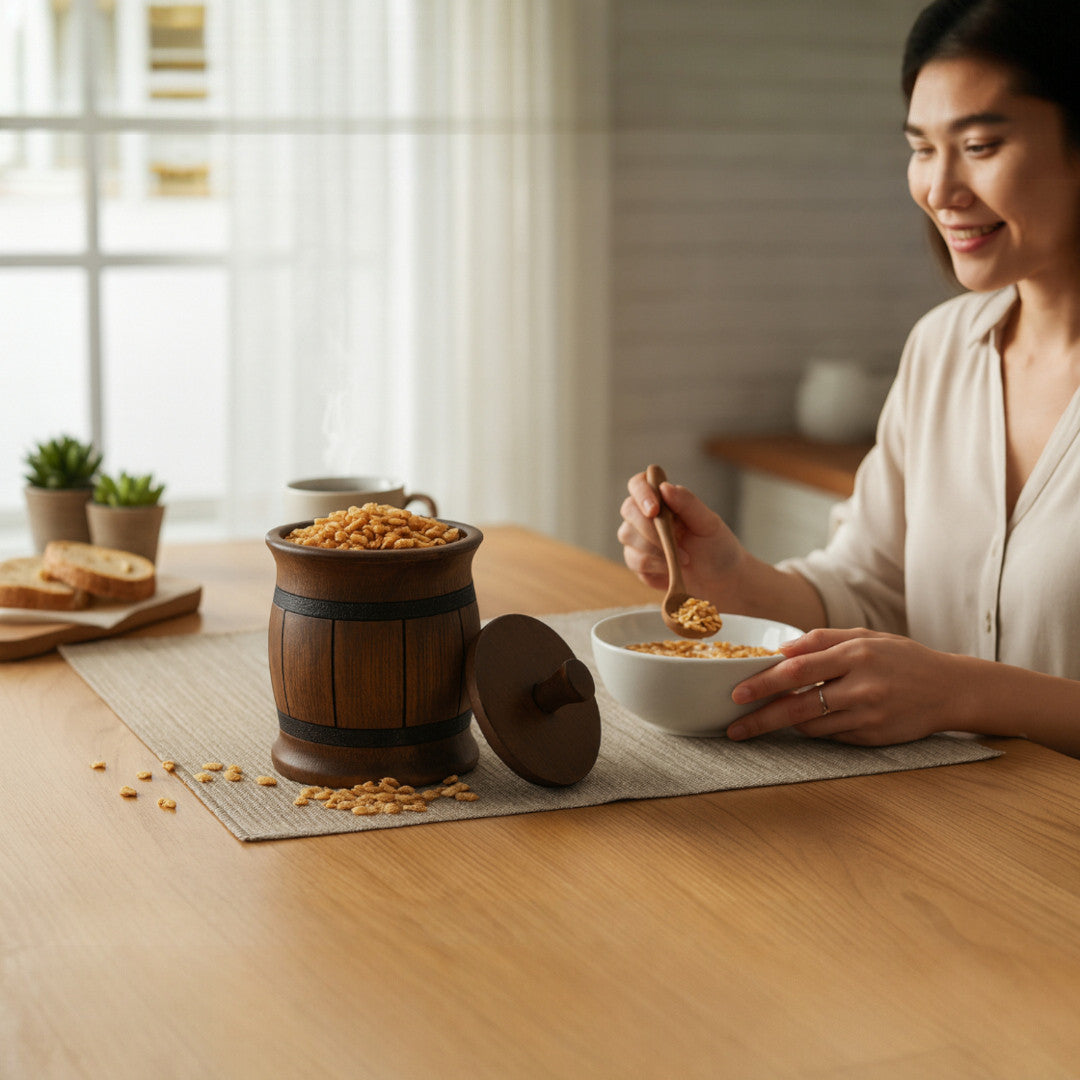 Perfekt zur Aufbewahrung von Müsli, Kaffee, Tee, Zucker, Gewürzen oder kleinen Snacks – oder als stilvolle Holzdekoration im Wohnraum.
